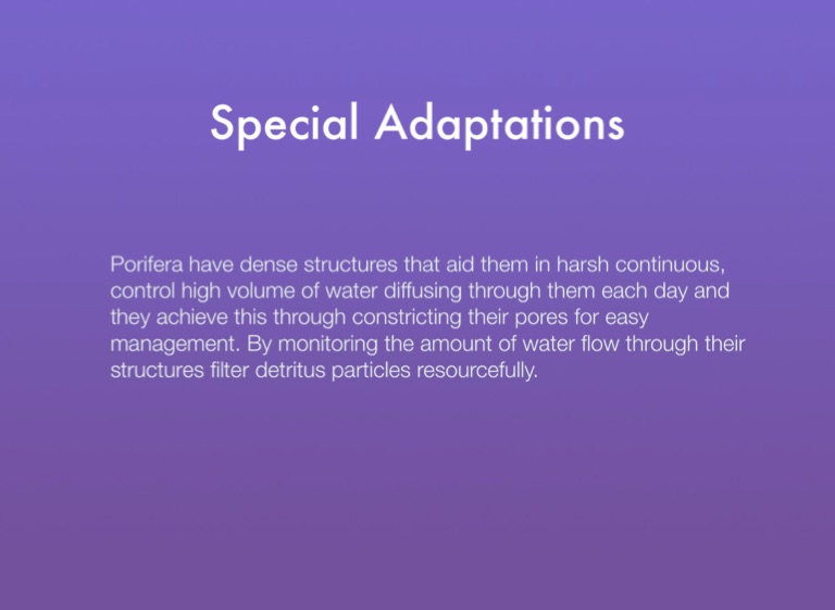 Porifera have dense structures that aid them in harsh continuous, control high volume of water diffusing through them each day and they achieve this through constricting their pores for easy management. By monitoring the amount of water flow through their structures filter detritus particles resourcefully.