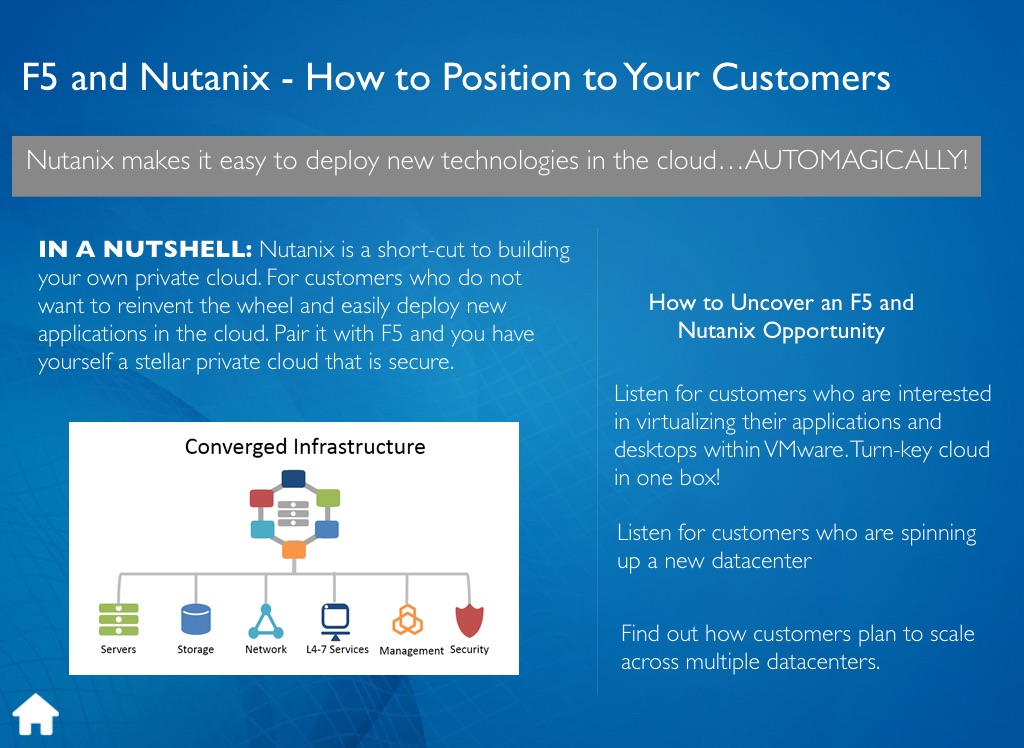 IN A NUTSHELL: Nutanix is a short-cut to building your own private cloud. For customers who do not want to reinvent the wheel and easily deploy new applications in the cloud. Pair it with F5 and you have yourself a stellar private cloud that is secure.