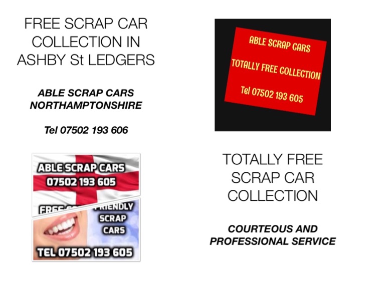 ABLE SCRAP CARS NORTHAMPTONSHIRE Tel 07502 193 605 Friendly, Courteous service Fast quotes FREE collection Best CASH prices for best cars NORTHAMPTONSHIRE, MILTON KEYNES & all local areas covered Tel 07502 193 605 DVLA informed All vehicles will be 100% going for recycled Scrap GUARANTEED unlike some Scrap dealers who will put Scrap cars back on the road, ............................................................................. NO HIDDEN FEES OR CHARGES GUARANTEED ( a lot of companies who offer 'free collection' will often ask for an 'Admin fee' once your vehicle is on the back of their truck ) WE DO NOT DO THIS! ............................................................................. So for absolute peace of mind Tel 07502 193 605 Receipts given collections 7 days a week to suit you scrap cars northampton, milton keynes, northampton, milton keynes scrap cars, scrap vehicles milton keynes, northampton, milton keynes scrap car companies, free scrap car collection milton keynes, northampton, cash for scrap cars milton keynes, northampton moulton park, great billing, corby, kettering, west haddon, bancroft park, bletchley, bradwell, broughton, caldecotte, fenny stratford, great linford, loughton, shenley, simpson, stantonbury, stony stratford, tattenhoe, walton, willen, wolverton, woolstone, woughton on the green, free scrap car collection, removal and disposal in Scrap Cars in Brackley, Northamptonshire covering Charlton, Croughton, Evenley, Farthinghoe, Greatworth, Helmdon, Mixbury, Newbottle, Westbury and Whitfield. Scrap Car yards, collection, removal, disposal in Corby, Northamptonshire covering Benefield, Brigstock, Caldecott, Cottingham, Deene, Great Easton, Great Oakley, Gretton, Middleton, Stanion and Weldon. Scrap Car yards, collection, removal, disposal in Daventry, Northamptonshire covering Ashby St Ledgers, Badby, Braunston, Crick, Flore, Grandborough, Kilsby, Long Buckby, Newnham, Norton, Staverton, Weedon, Welton, Whilton, Willoughby and Wolfhampcote. Scrap Car yards, collection, removal, disposal in Kettering, Northamptonshire covering Barton Seagrave, Broughton, Cranford St John, Cransley, Geddington, Isham, Little Addington, Mawsley, Orton, Pytchley, Rothwell, Rushton and Thorpe Malsor. Scrap Car yards, collection, removal, disposal in Northampton, Northamptonshire covering Blisworth, Boughton, Brackmills, Brington, Bugbroke, Cogenhoe, Collingtree, Denton, Duston, Great Billing, Hackleton, Hardingstone, Harpole, Holcot, Kislingbury, Milton Malsor, Moulton, Never Heyford, Overstone, Pitsford, Quinton, Sywell, Upton and Wooton. Scrap Car yards, collection, removal, disposal in Oundle, Northamptonshire covering Ashton, Barnwell, Cotterstock, Elton, Glapthorn, Polebrook, Southwick, Tansor and Warmington. Scrap Car yards, collection, removal, disposal in Rushden, Northamptonshire covering Chelveston, Higham Ferrers, Irchester, Irthlingborough, Little Addington, Knuston, Newton Bromswold, Raunds, Stanwick and Wymington. Scrap Car yards, collection, removal, disposal in Thrapston, Northamptonshire covering Aldwincle, Denford, Great Addington, Islip, Keyston, Lowick, Slipton, Ringstead, Sudborough, Thorpe Achurch, Titchmarsh, Twywell and Woodford. Scrap Car yards, collection, removal, disposal in Towcester, Northamptonshire covering Caldecote, Easton Neston, Foscote, Greens Norton, Handley Park, Hulcote, Showsley, Shutlanger, Tiffield and Wood Burcote. Scrap Car yards, collection, removal, disposal in Wellingborough, Northamptonshire covering Earls Barton, Finedon, Great Harrowden, Hardwick, Mears Ashby, Orlingbury, Red Hill and Willby