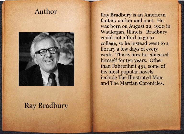 Ray Bradbury is an American fantasy author and poet. He was born on August 22, 1920 in Waukegan, Illinois. Bradbury could not afford to go to college, so he instead went to a library a few days of every week. This is how he educated himself for ten years. Other than Fahrenheit 451, some of his most popular novels include The Illustrated Man and The Martian Chronicles.