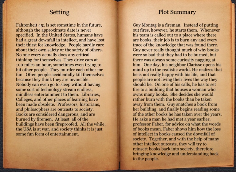 Fahrenheit 451 is set sometime in the future, although the approximate date is never specified. In the United States, humans have had a great downfall in intellect, and have lost their thirst for knowledge. People hardly care about their own safety or the safety of others. No one every actually does any critical thinking for themselves. They drive cars at 100 miles an hour, sometimes even trying to hit other people. They murder each other for fun. Often people accidentally kill themselves because they think they are invincible. Nobody can even go to sleep without having some sort of technology stream endless, mindless entertainment to them. Libraries, Colleges, and other places of learning have been made obsolete. Professors, historians, and philosophers are outcasts to society. Books are considered dangerous, and are burned by firemen. At least all of the buildings have been fireproofed. All the while, the USA is at war, and society thinks it is just some fun form of entertainment.