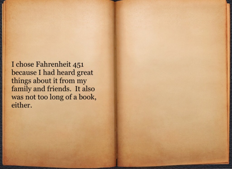 I chose Fahrenheit 451 because I had heard great things about it from my family and friends. It also was not too long of a book, either.
