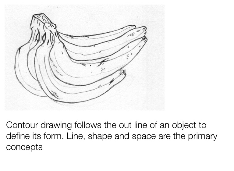 Contour drawing follows the out line of an object to define its form. Line, shape and space are the primary concepts