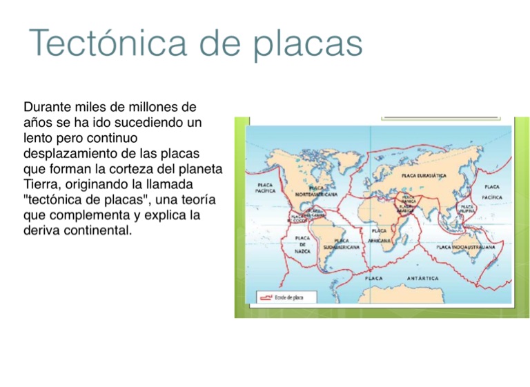 Durante miles de millones de años se ha ido sucediendo un lento pero continuo desplazamiento de las placas que forman la corteza del planeta Tierra, originando la llamada "tectónica de placas", una teoría que complementa y explica la deriva continental.