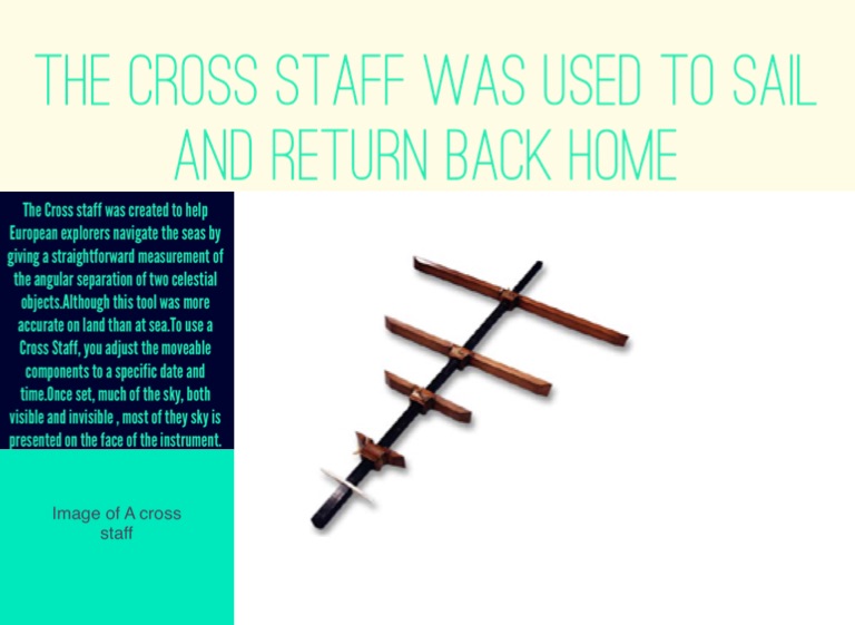 The Cross staff was created to help European explorers navigate the seas by giving a straightforward measurement of the angular separation of two celestial objects.Although this tool was more accurate on land than at sea.To use a Cross Staff, you adjust the moveable components to a specific date and time.Once set, much of the sky, both visible and invisible , most of they sky is presented on the face of the instrument.
