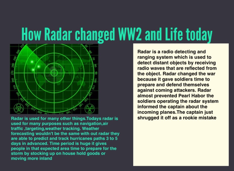 Radar is a radio detecting and ranging system which is used to detect distant objects by receiving radio waves that are reflected from the object. Radar changed the war because it gave soldiers time to prepare and defend themselves against coming attackers. Radar almost prevented Pearl Habor the soldiers operating the radar system informed the captain about the incoming planes.The captain just shrugged it off as a rookie mistake