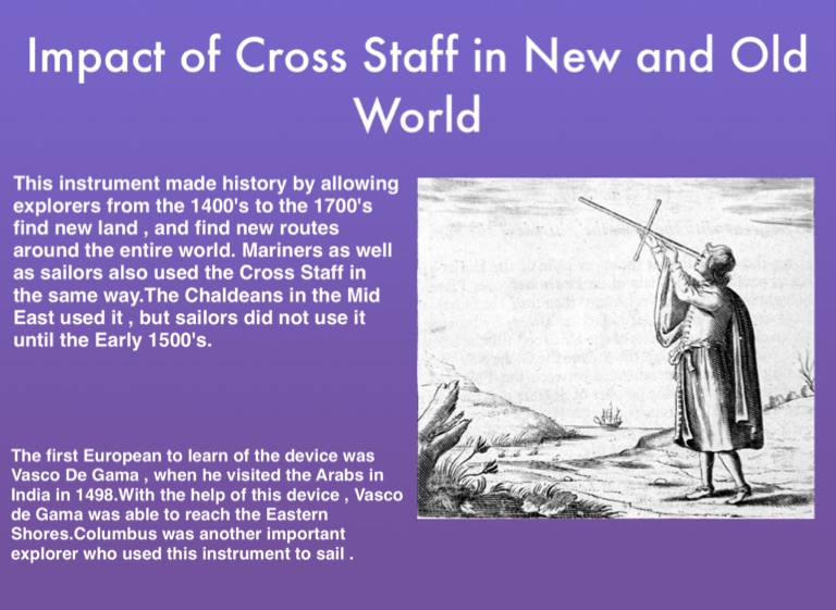 This instrument made history by allowing explorers from the 1400's to the 1700's find new land , and find new routes around the entire world. Mariners as well as sailors also used the Cross Staff in the same way.The Chaldeans in the Mid East used it , but sailors did not use it until the Early 1500's.