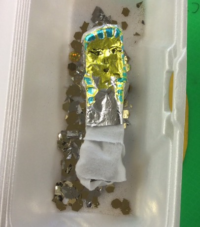 9) I wrapped up the potato, decorated the sarcophagus and put gold sequence in it.