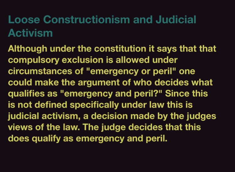 Although under the constitution it says that that compulsory exclusion is allowed under circumstances of "emergency or peril" one could make the argument of who decides what qualifies as "emergency and peril?" Since this is not defined specifically under law this is judicial activism, a decision made by the judges views of the law. The judge decides that this does qualify as emergency and peril.