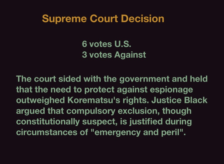The court sided with the government and held that the need to protect against espionage outweighed Korematsu's rights. Justice Black argued that compulsory exclusion, though constitutionally suspect, is justified during circumstances of "emergency and peril".