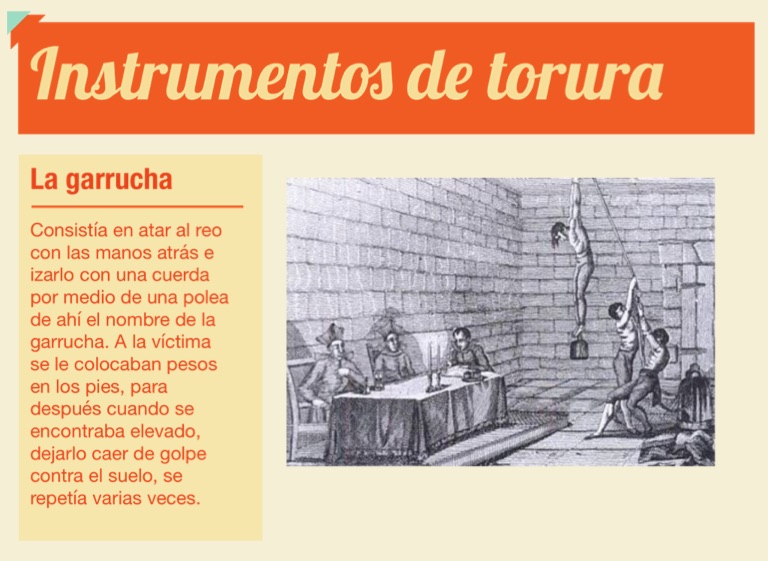 Consistía en atar al reo con las manos atrás e izarlo con una cuerda por medio de una polea de ahí el nombre de la garrucha. A la víctima se le colocaban pesos en los pies, para después cuando se encontraba elevado, dejarlo caer de golpe contra el suelo, se repetía varias veces.