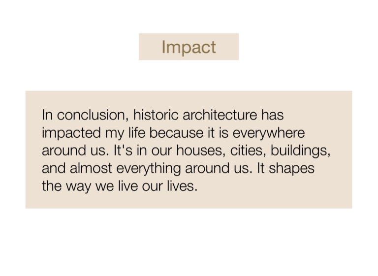 In conclusion, historic architecture has impacted my life because it is everywhere around us. It's in our houses, cities, buildings, and almost everything around us. It shapes the way we live our lives.