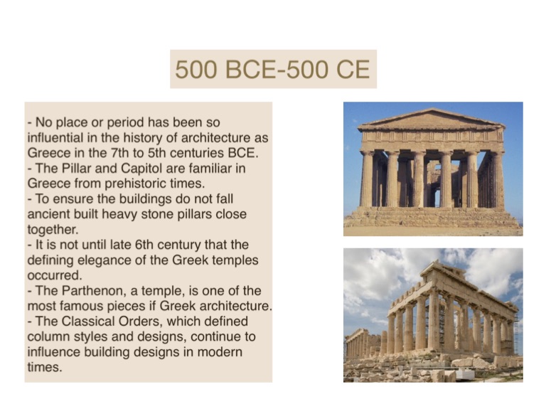- No place or period has been so influential in the history of architecture as Greece in the 7th to 5th centuries BCE.