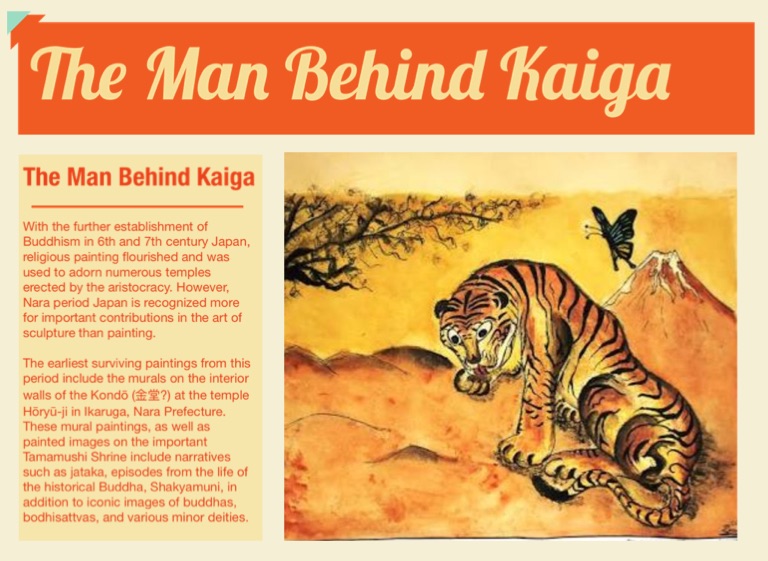 The earliest surviving paintings from this period include the murals on the interior walls of the Kondō (金堂?) at the temple Hōryū-ji in Ikaruga, Nara Prefecture. These mural paintings, as well as painted images on the important Tamamushi Shrine include narratives such as jataka, episodes from the life of the historical Buddha, Shakyamuni, in addition to iconic images of buddhas, bodhisattvas, and various minor deities.