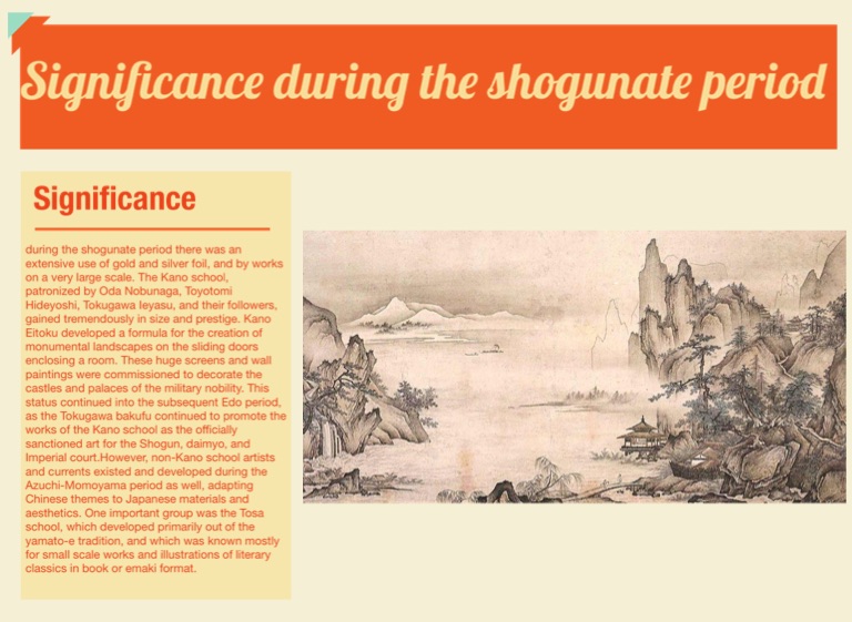 during the shogunate period there was an extensive use of gold and silver foil, and by works on a very large scale. The Kano school, patronized by Oda Nobunaga, Toyotomi Hideyoshi, Tokugawa Ieyasu, and their followers, gained tremendously in size and prestige. Kano Eitoku developed a formula for the creation of monumental landscapes on the sliding doors enclosing a room. These huge screens and wall paintings were commissioned to decorate the castles and palaces of the military nobility. This status continued into the subsequent Edo period, as the Tokugawa bakufu continued to promote the works of the Kano school as the officially sanctioned art for the Shogun, daimyo, and Imperial court.However, non-Kano school artists and currents existed and developed during the Azuchi-Momoyama period as well, adapting Chinese themes to Japanese materials and aesthetics. One important group was the Tosa school, which developed primarily out of the yamato-e tradition, and which was known mostly for small scale works and illustrations of literary classics in book or emaki format.