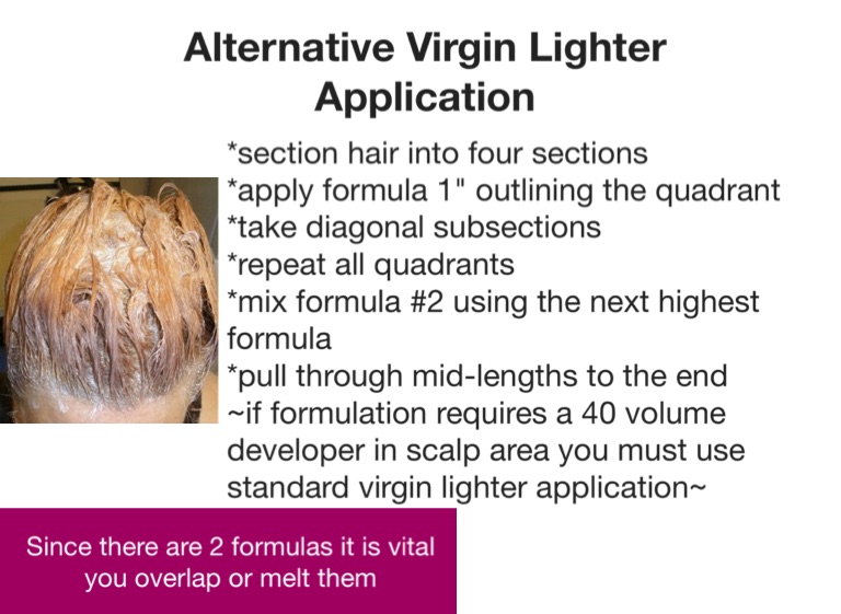 ~if formulation requires a 40 volume developer in scalp area you must use standard virgin lighter application~