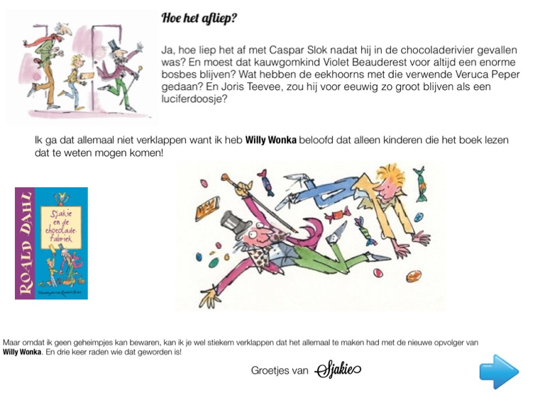 Ja, hoe liep het af met Caspar Slok nadat hij in de chocoladerivier gevallen was? En moest dat kauwgomkind Violet Beauderest voor altijd een enorme bosbes blijven? Wat hebben de eekhoorns met die verwende Veruca Peper gedaan? En Joris Teevee, zou hij voor eeuwig zo groot blijven als een luciferdoosje?