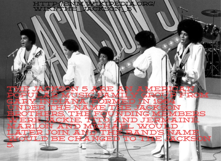 The Jackson 5 are an American popular music family group from Gary, Indiana. Formed in 1964 under the name The Jackson Brothers, the founding members were Jackie, Tito, and Jermaine. Marlon and Michael would later join, and the band's name would be changed to The Jackson 5.