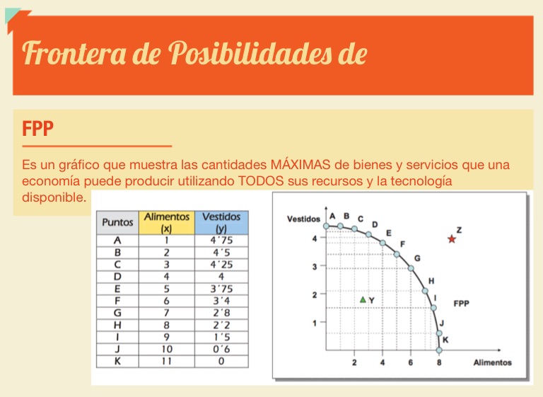 Es un gráfico que muestra las cantidades MÁXIMAS de bienes y servicios que una economía puede producir utilizando TODOS sus recursos y la tecnología disponible.