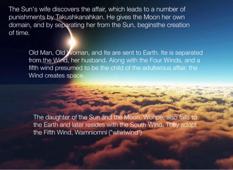 The Sun's wife discovers the affair, which leads to a number of punishments by Takushkanahkan. He gives the Moon her own domain, and by separating her from the Sun, beginsthe creation of time.