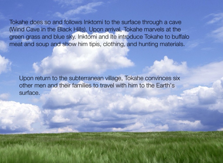 Tokahe does so and follows Inktomi to the surface through a cave (Wind Cave in the Black Hills). Upon arrival, Tokahe marvels at the green grass and blue sky. Inktomi and Ite introduce Tokahe to buffalo meat and soup and show him tipis, clothing, and hunting materials.