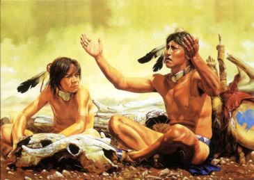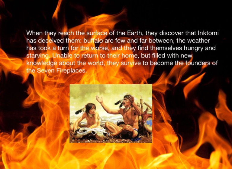 When they reach the surface of the Earth, they discover that Inktomi has deceived them: buffalo are few and far between, the weather has took a turn for the worse, and they find themselves hungry and starving. Unable to return to their home, but filled with new knowledge about the world, they survive to become the founders of the Seven Fireplaces.