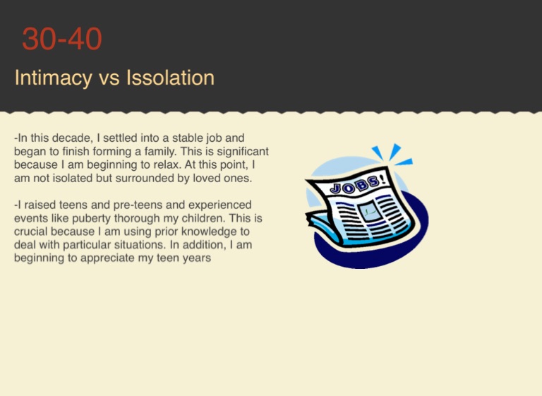 -In this decade, I settled into a stable job and began to finish forming a family. This is significant because I am beginning to relax. At this point, I am not isolated but surrounded by loved ones.