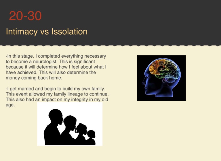 -I get married and begin to build my own family. This event allowed my family lineage to continue. This also had an impact on my integrity in my old age.