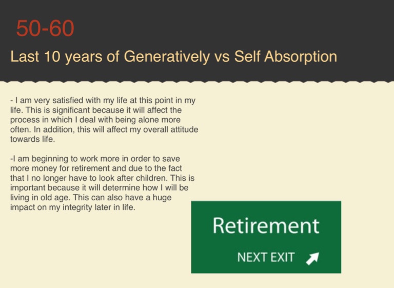 -I am beginning to work more in order to save more money for retirement and due to the fact that I no longer have to look after children. This is important because it will determine how I will be living in old age. This can also have a huge impact on my integrity later in life.
