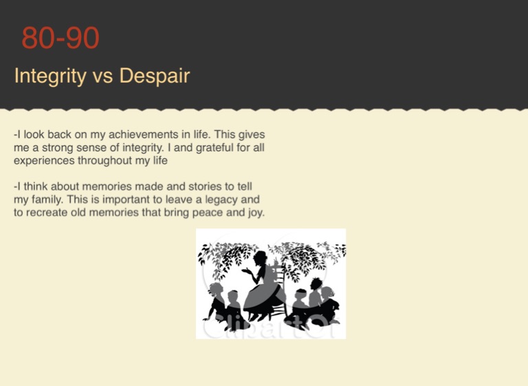 -I look back on my achievements in life. This gives me a strong sense of integrity. I and grateful for all experiences throughout my life
