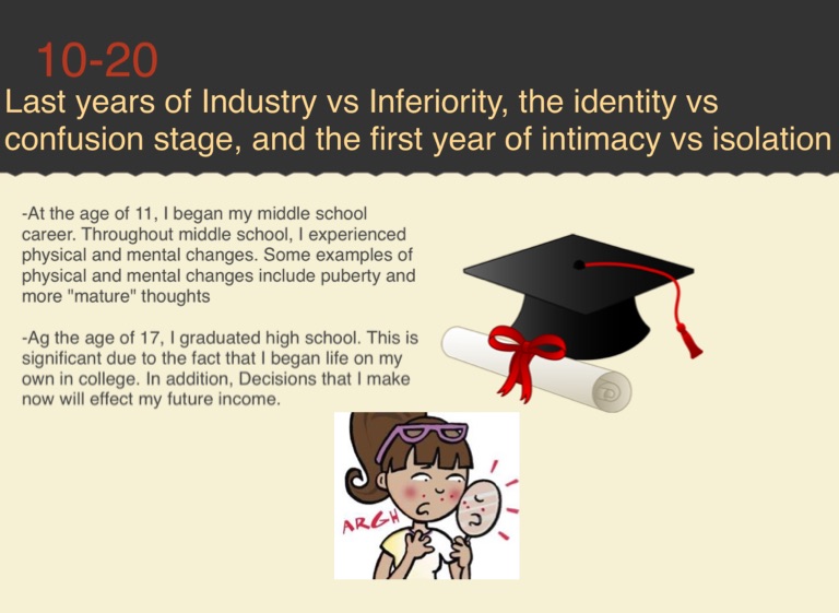 Last years of Industry vs Inferiority, the identity vs confusion stage, and the first year of intimacy vs isolation