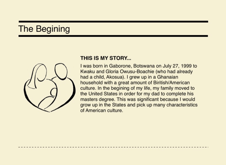 I was born in Gaborone, Botswana on July 27, 1999 to Kwaku and Gloria Owusu-Boachie (who had already had a child, Akosua). I grew up in a Ghanaian household with a great amount of Biritish/American culture. In the begining of my life, my family moved to the United States in order for my dad to complete his masters degree. This was significant because I would grow up in the States and pick up many characteristics of American culture.