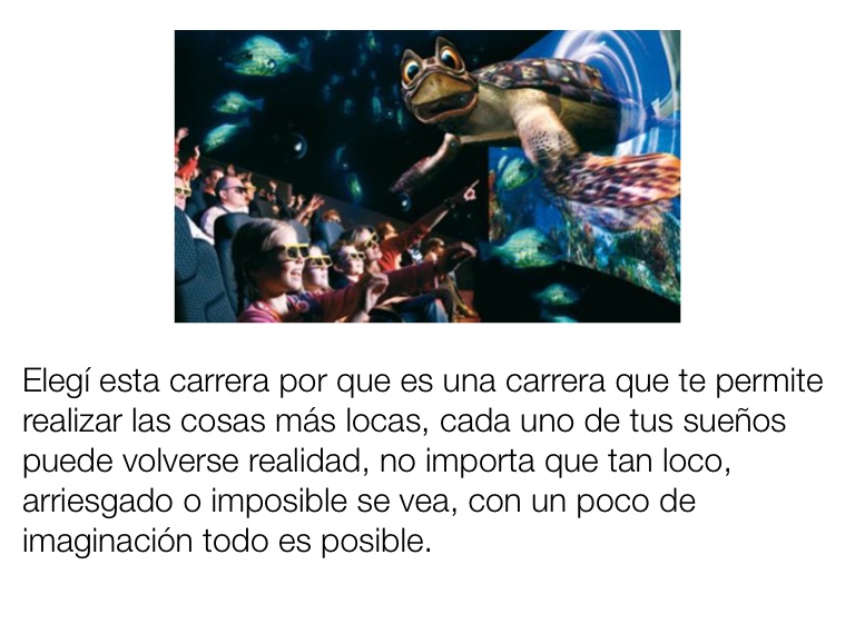 Elegí esta carrera por que es una carrera que te permite realizar las cosas más locas, cada uno de tus sueños puede volverse realidad, no importa que tan loco, arriesgado o imposible se vea, con un poco de imaginación todo es posible.