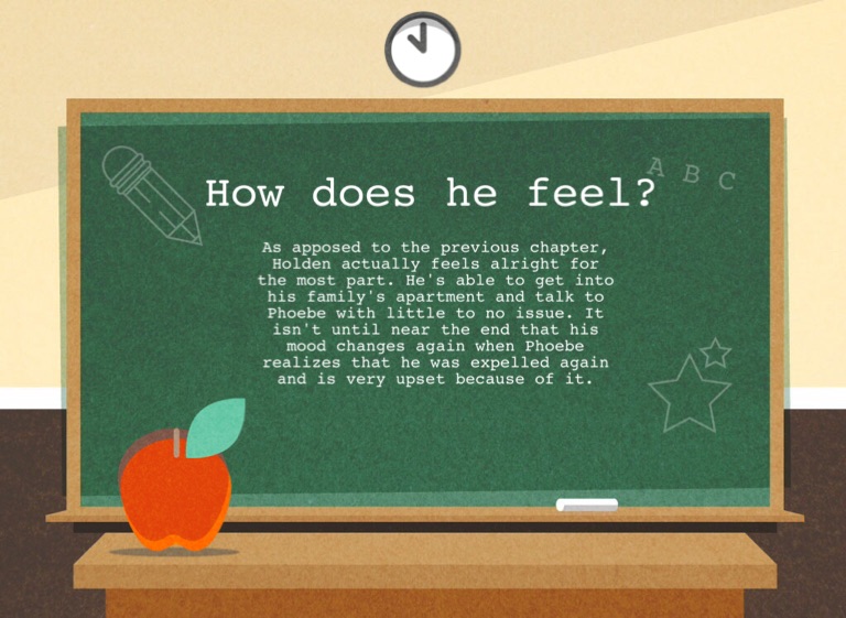 As apposed to the previous chapter, Holden actually feels alright for the most part. He's able to get into his family's apartment and talk to Phoebe with little to no issue. It isn't until near the end that his mood changes again when Phoebe realizes that he was expelled again and is very upset because of it.