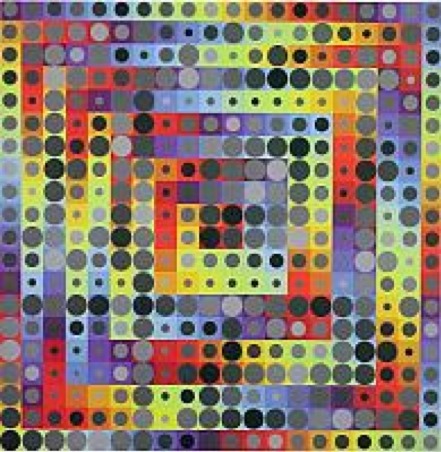 Orion Gris displays color, line, shape, and movement. The background of the dots represent color. The shading of the dots show that they are meant to be moving. The grid of boxes behind the dots demonstrate line. Lastly, the dots bring shape to the artwork.