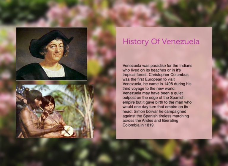 Venezuela was paradise for the Indians who lived on its beaches or in it's tropical forest. Christopher Columbus was the first European to visit Venezuela, he came in 1498 during his third voyage to the new world. Venezuela may have been a quiet outpost on the edge of the Spanish empire but it gave birth to the man who would one day turn that empire on its head: Simon bolivar he campaigned against the Spanish tireless marching across the Andes and liberating Colombia in 1819.