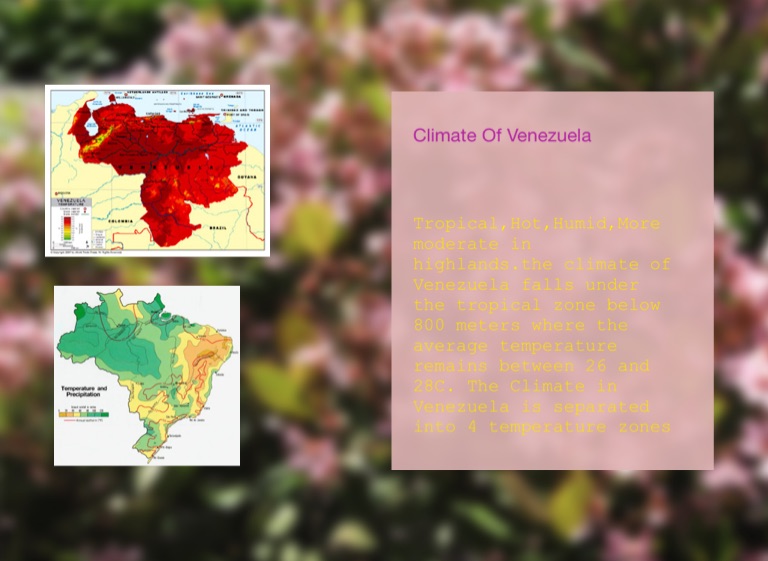 Tropical,Hot,Humid,More moderate in highlands.the climate of Venezuela falls under the tropical zone below 800 meters where the average temperature remains between 26 and 28C. The Climate in Venezuela is separated into 4 temperature zones