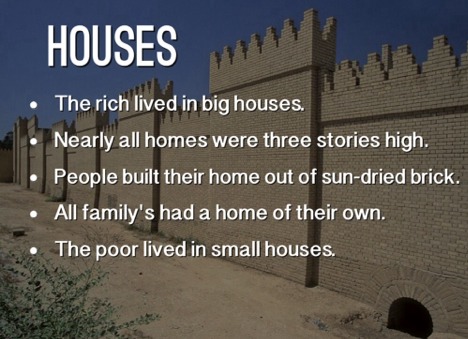 In the cities of Sumer whether they were rich or poor everyone had a home. The poor people had narrow houses and the rich people had wide houses. All homes were three stories high. The first floor was an entryway and a courtyard sometimes kids played their or meals were cooked. The second floor was were the family lived. People used the roof like a floor because it was flat. Houses were built out of mud bricks and blocks.