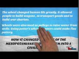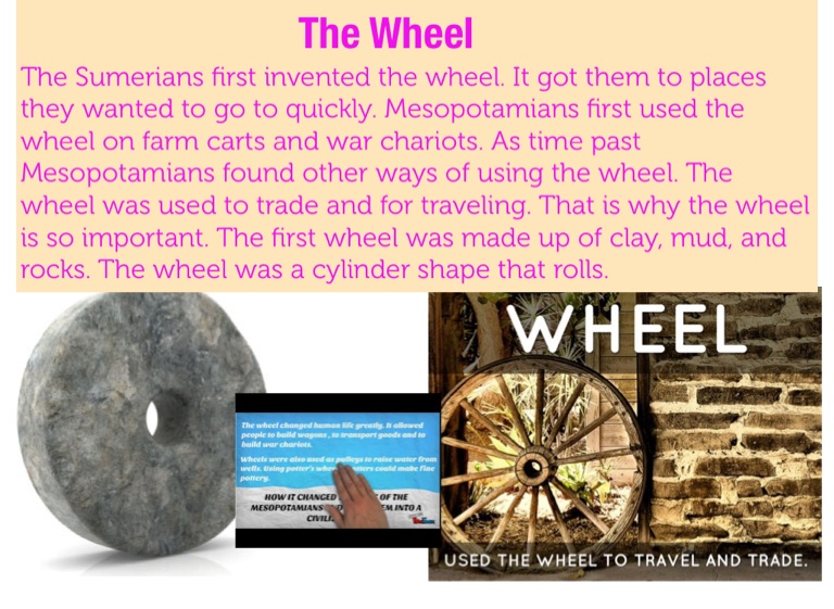 The Sumerians first invented the wheel. It got them to places they wanted to go to quickly. Mesopotamians first used the wheel on farm carts and war chariots. As time past Mesopotamians found other ways of using the wheel. The wheel was used to trade and for traveling. That is why the wheel is so important. The first wheel was made up of clay, mud, and rocks. The wheel was a cylinder shape that rolls.