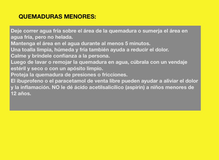 Deje correr agua fría sobre el área de la quemadura o sumerja el área en agua fría, pero no helada.