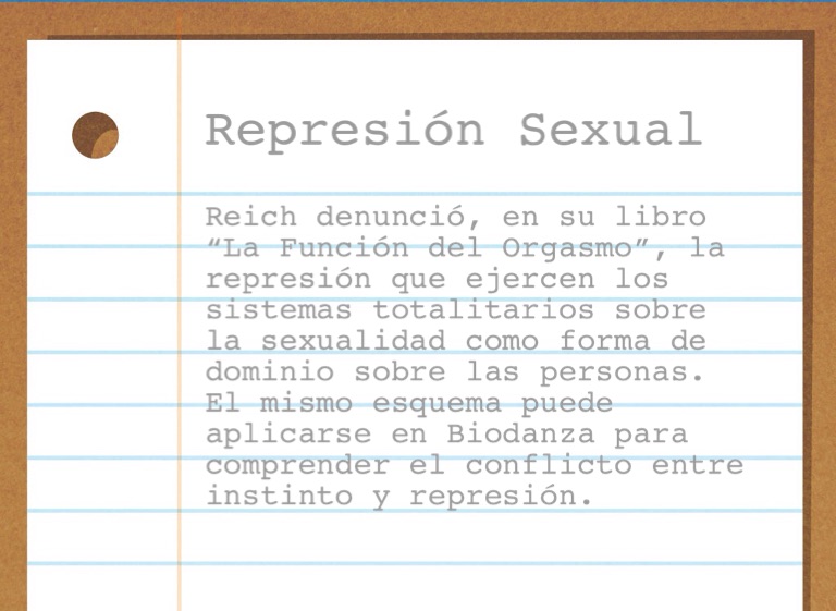 Reich denunció, en su libro “La Función del Orgasmo”, la represión que ejercen los sistemas totalitarios sobre la sexualidad como forma de dominio sobre las personas. El mismo esquema puede aplicarse en Biodanza para comprender el conflicto entre instinto y represión.