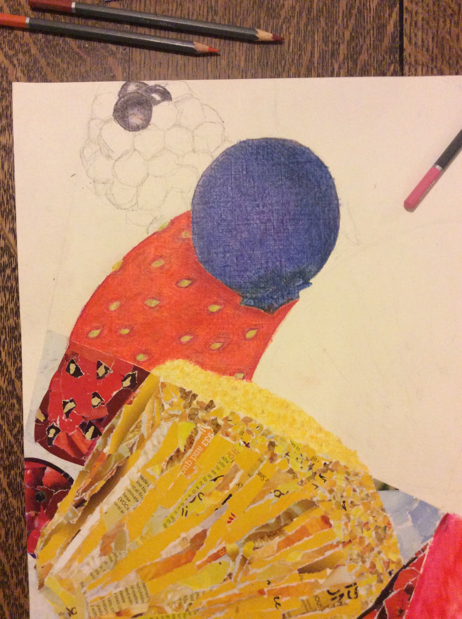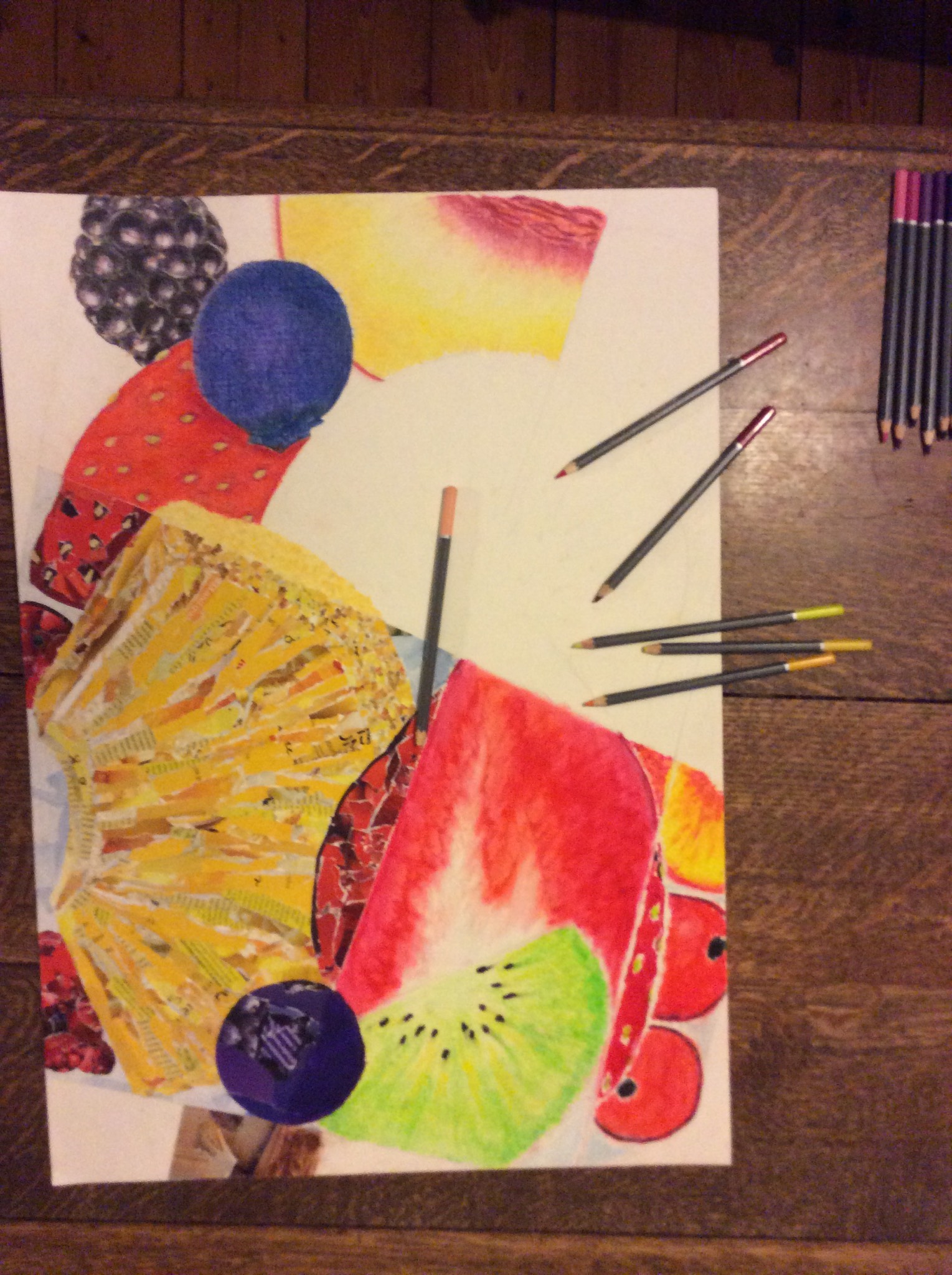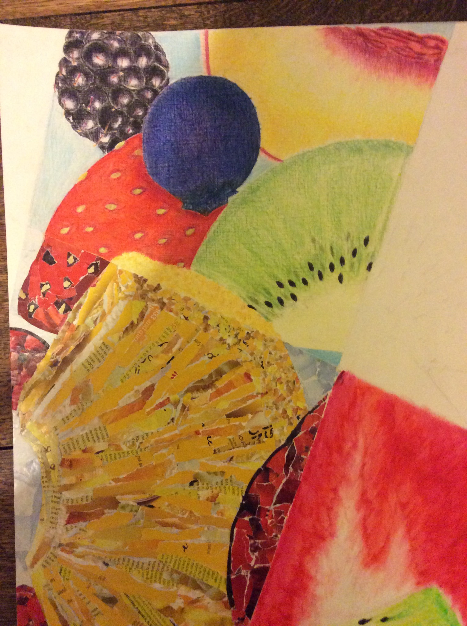 I really enjoyed doing the pencil section, and the hardest part of the was the strawberry seeds. The blackberry also took a long time as I had to do each bump one by one. I used white pencil a lot (especially in the inside of the kiwifruit) to blend colours as well as lighten parts and used the white underneath the blue for the ice to stop it being too dark. I used the pictures below to help me get the right colours and textures for each piece of fruit.