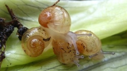Two adult snails-both of whom usually have both male and female reproductive organs-will mate and both will produce fertilized eggs. The eggs are deposited into the soil and will remain there for about four weeks before hatching. The larvae have a shell at birth, but must quickly consume calcium to make the shell grow hard. The snail will continue to mature and in most species doesn't reach sexual maturity for a couple of years.