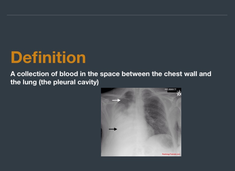 A collection of blood in the space between the chest wall and the lung (the pleural cavity)
