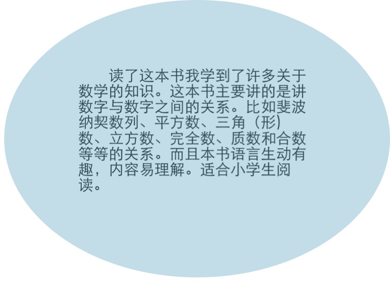 读了这本书我学到了许多关于数学的知识。这本书主要讲的是讲数字与数字之间的关系。比如斐波纳契数列、平方数、三角(形)数、立方数、完全数、质数和合数等等的关系。而且本书语言生动有趣,内容易理解。适合小学生阅读。