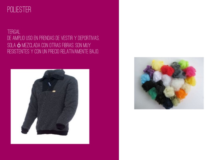 De amplio uso en prendas de vestir y deportivas, sola ó mezclada con otras fibras. Son muy resistentes y con un precio relativamente bajo.