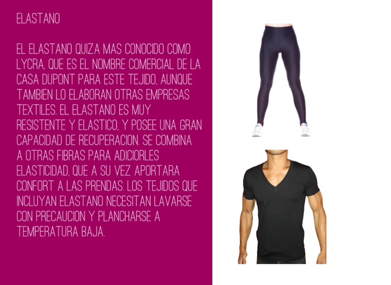 El elastano Quiza mas conocido como Lycra, que es el nombre comercial de la casa Dupont para este tejido, aunque tambien lo elaboran otras empresas textiles. El elastano es muy resistente y elastico, y posee una gran capacidad de recuperacion. Se combina a otras fibras para adiciorles elasticidad, que a su vez aportara confort a las prendas. Los tejidos que incluyan elastano necesitan lavarse con precaucion y plancharse a temperatura baja.
