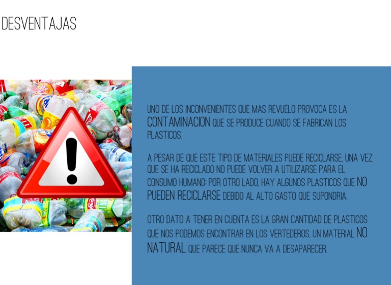 Uno de los inconvenientes que mas revuelo provoca es la contaminacion que se produce cuando se fabrican los plasticos.