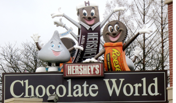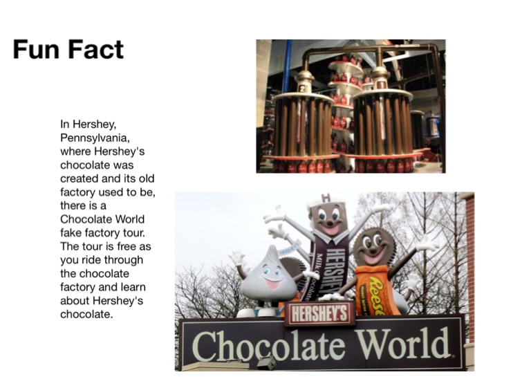 In Hershey, Pennsylvania, where Hershey's chocolate was created and its old factory used to be, there is a Chocolate World fake factory tour. The tour is free as you ride through the chocolate factory and learn about Hershey's chocolate.
