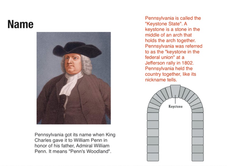 Pennsylvania is called the "Keystone State". A keystone is a stone in the middle of an arch that holds the arch together. Pennsylvania was referred to as the "keystone in the federal union" at a Jefferson rally in 1802. Pennsylvania held the country together, like its nickname tells.